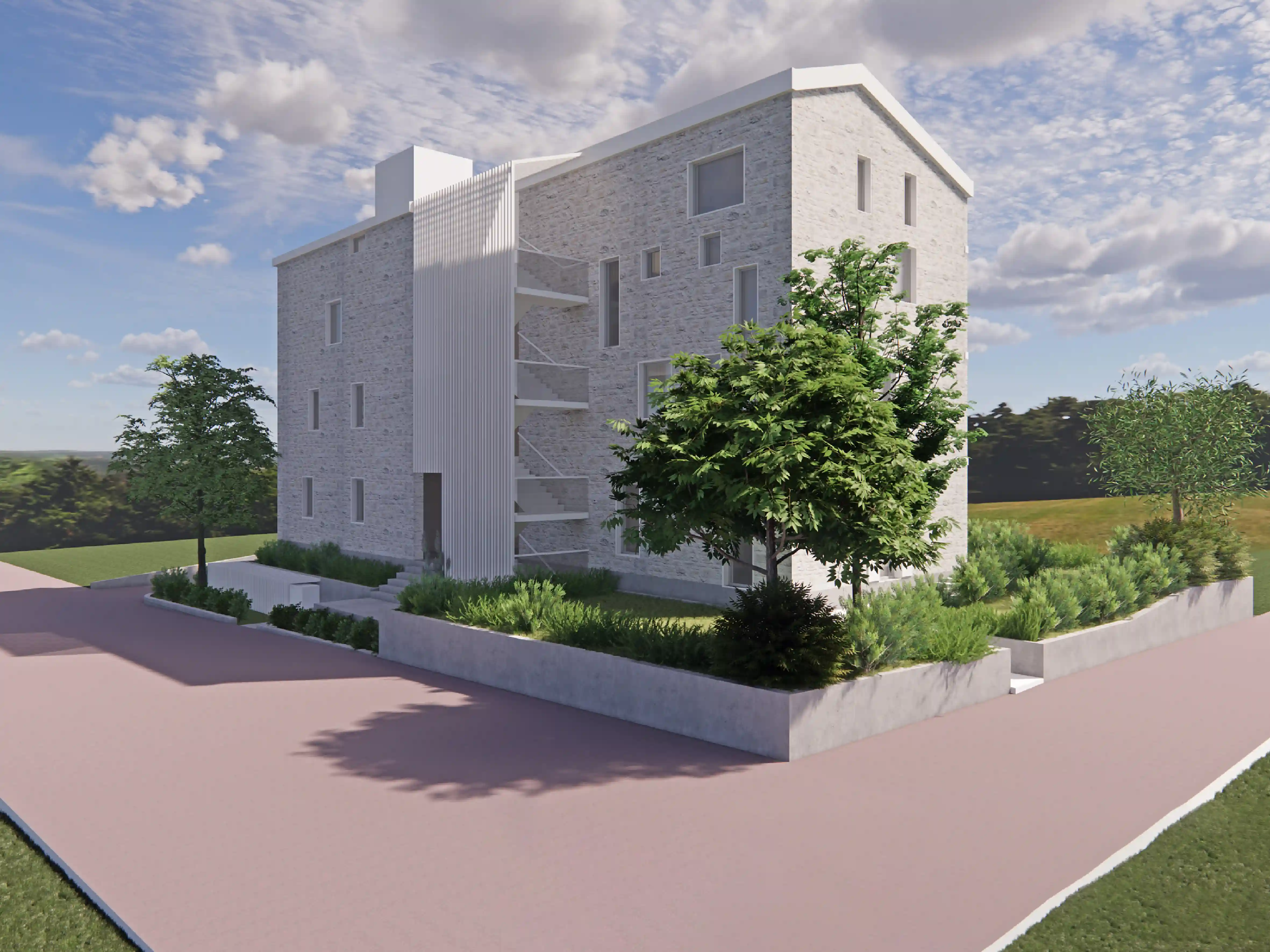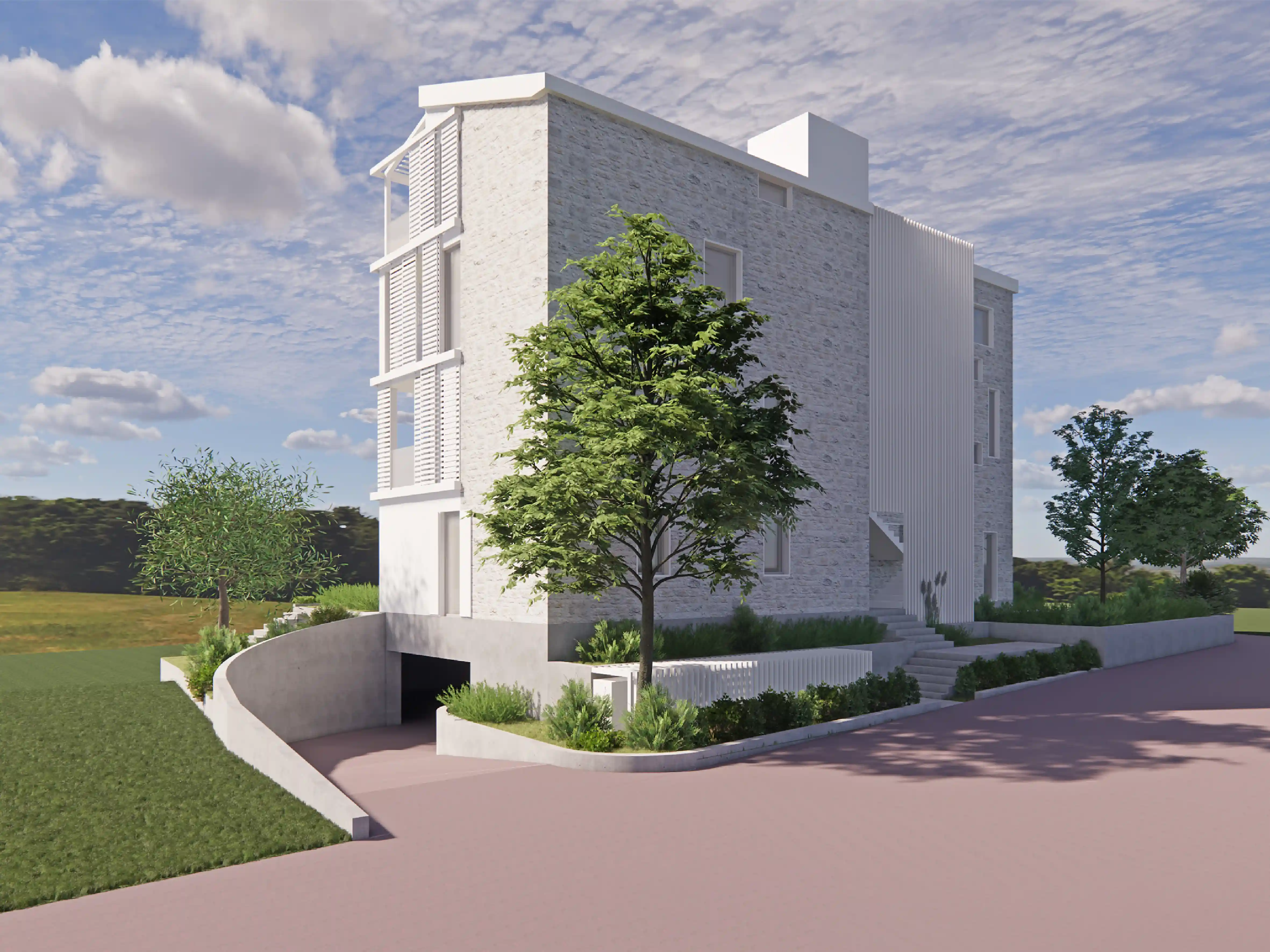 Stavba se smiselno vklaplja v lokalno okolje: členitev volumna in obloga iz lokalnega kamna jo približuje drobnejši pozidavi vasi. Igriva uporaba tradicionalne strehe preko zamaknjenih volumnov ji dodaja sodobni nadih. Zunanja ureditev z bogatim mediteranskim rastlinjem stavbo staplja z okolico ter uporabnikom nudi prijetno senco in udobje.