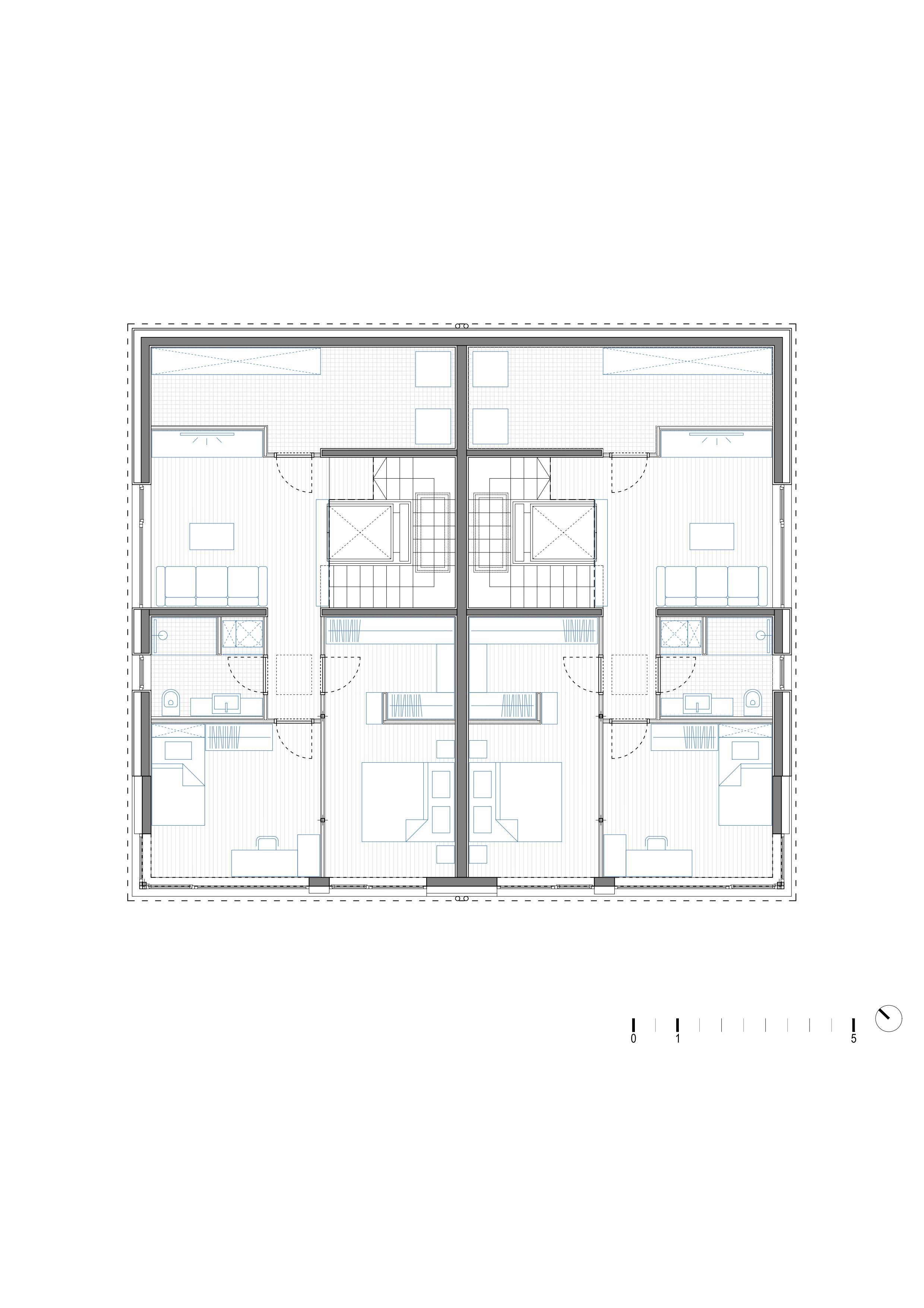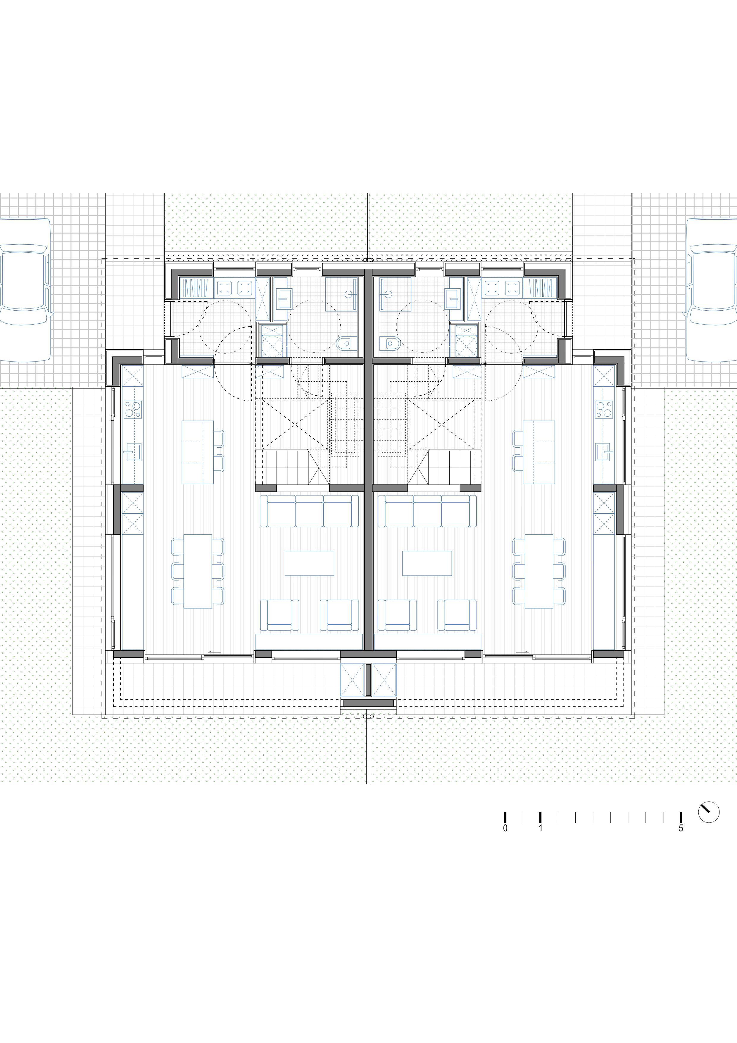Vsak dvojček sestavljata dve simetrični stanovanjski enoti z vhodom iz severovzhodne ali severozahodne strani. Vhodni predprostor deluje kot vetrolov in vodi v osrednji bivalni del. Odprto stopnišče v središču tlorisa povezuje pritličje z mansardo, pod njim je skrit vhod v kopalnico. Ob stopnišču je kuhinja z otokom, ki se nadaljuje v jedilnico in dnevni prostor z izhodom na vrt. Zunanje površine so delno pokrite s previsom mansarde, kar omogoča zaščito pred vremenskimi vplivi.