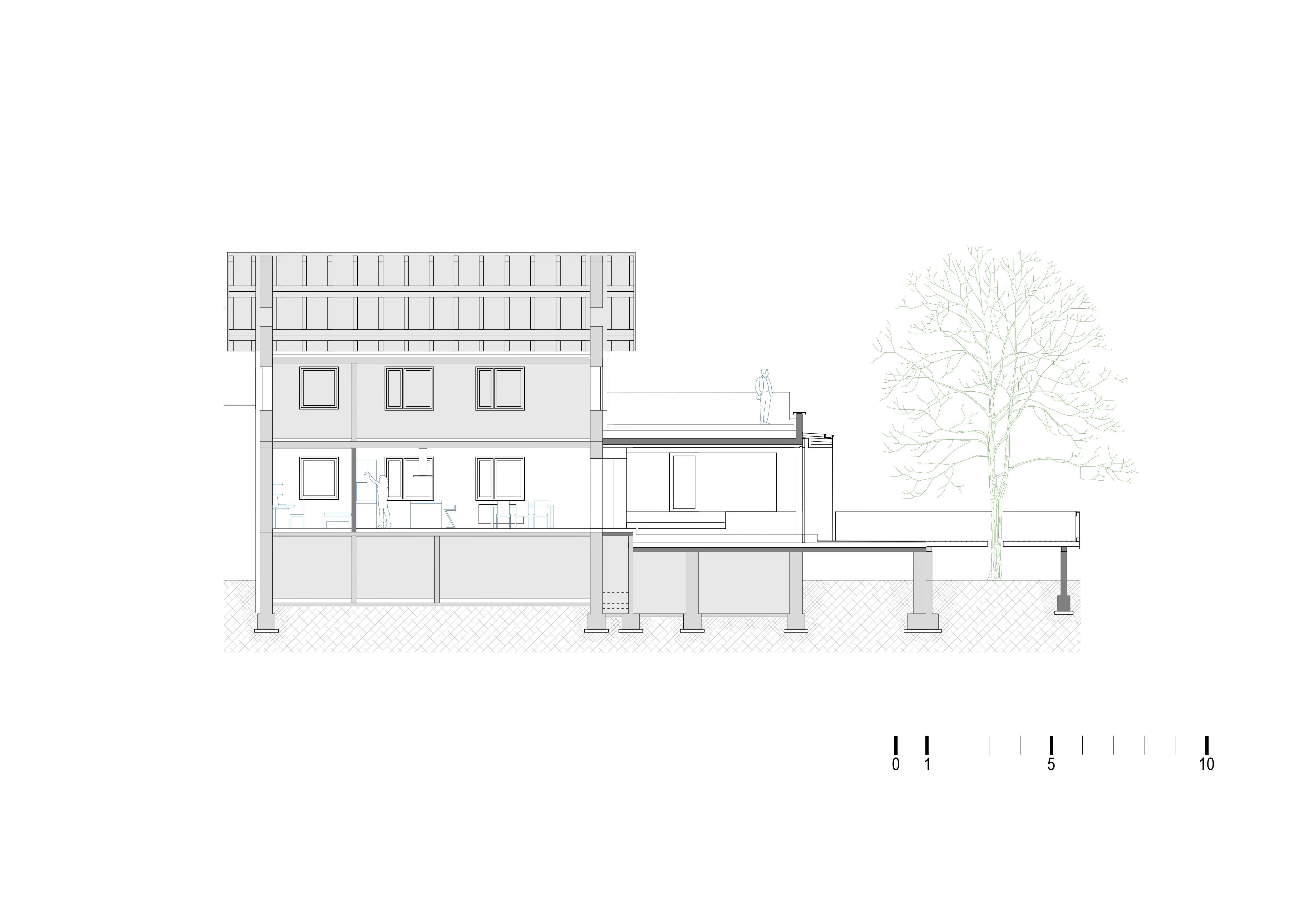 Bivalni paviljon predstavlja premišljeno dopolnitev večstanovanjske hiše, ki z minimalnim prizidkom in prostorno teraso ustvarja razkošen podaljšek bivalnih površin ter družini omogoča bivanje na prostem in zasebnost obenem.