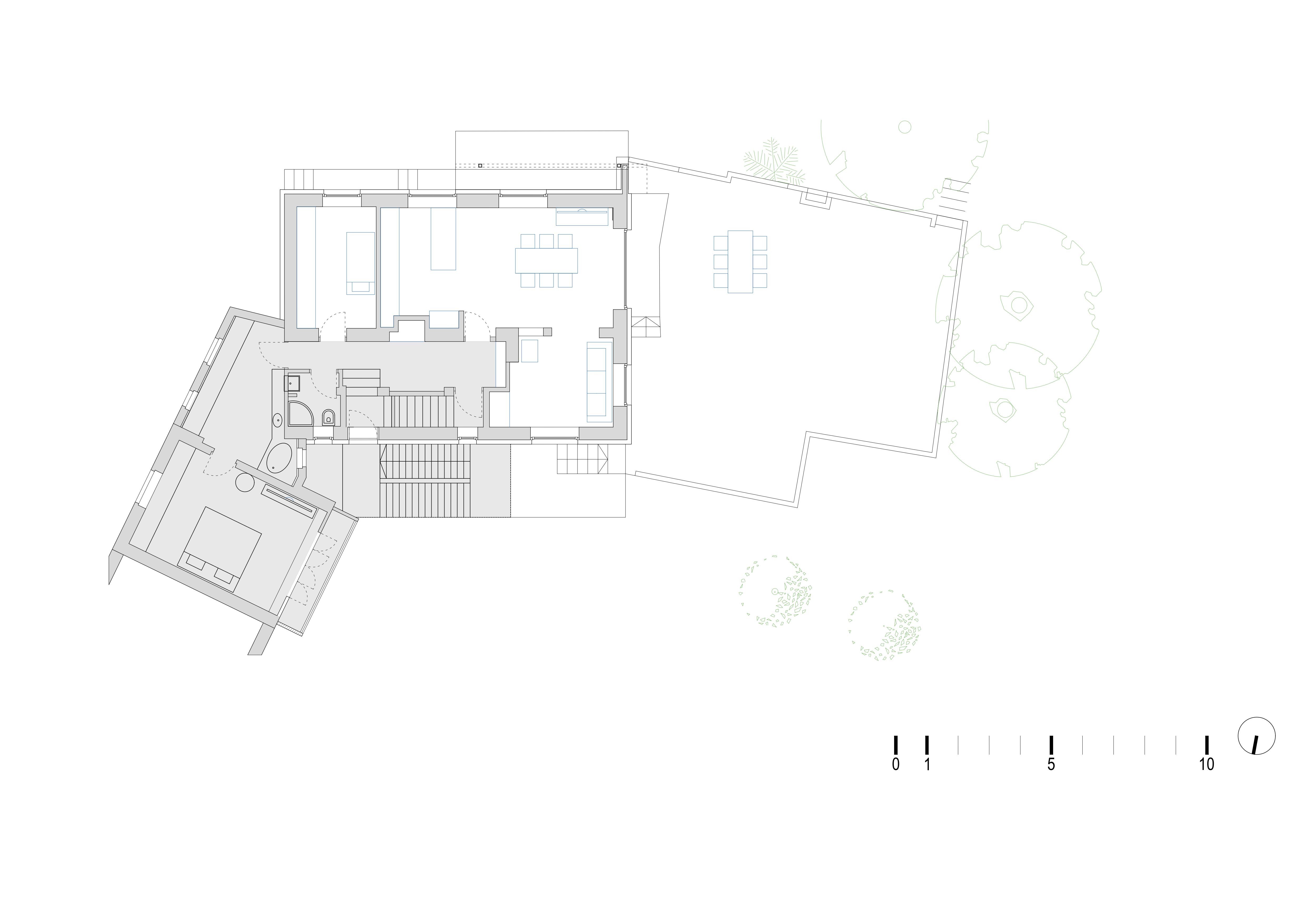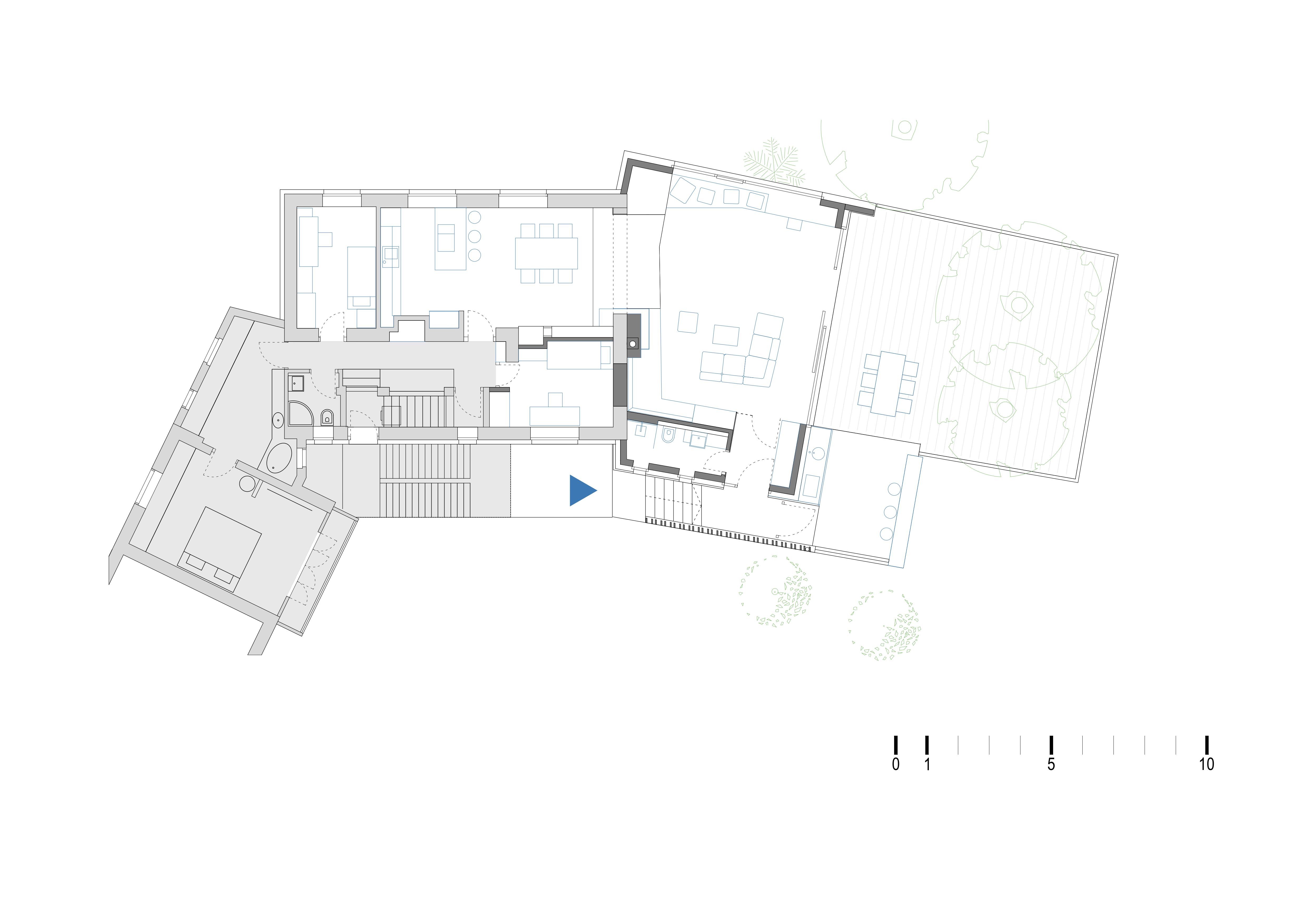 Obstoječi stanovanjski prostori se preko novega dnevnega prostora brez prekinitve nadaljujejo na leseno teraso z odprtimi pogledi na Šmarno goro in drevje vrta. Terasa je v poletnem času zasnovana kot glavna dnevna soba, zaščitena pred pogledi. S svojo površino objema obstoječi hruški, ki poleti s krošnjo, pozimi pa s transparentno prepustnostjo prispevata h klimatskemu udobju. Bivalni paviljon je zgrajen na temelje nekdanjega zimskega vrta kot kombinacija armiranobetonske konstrukcije in lesenih elementov.