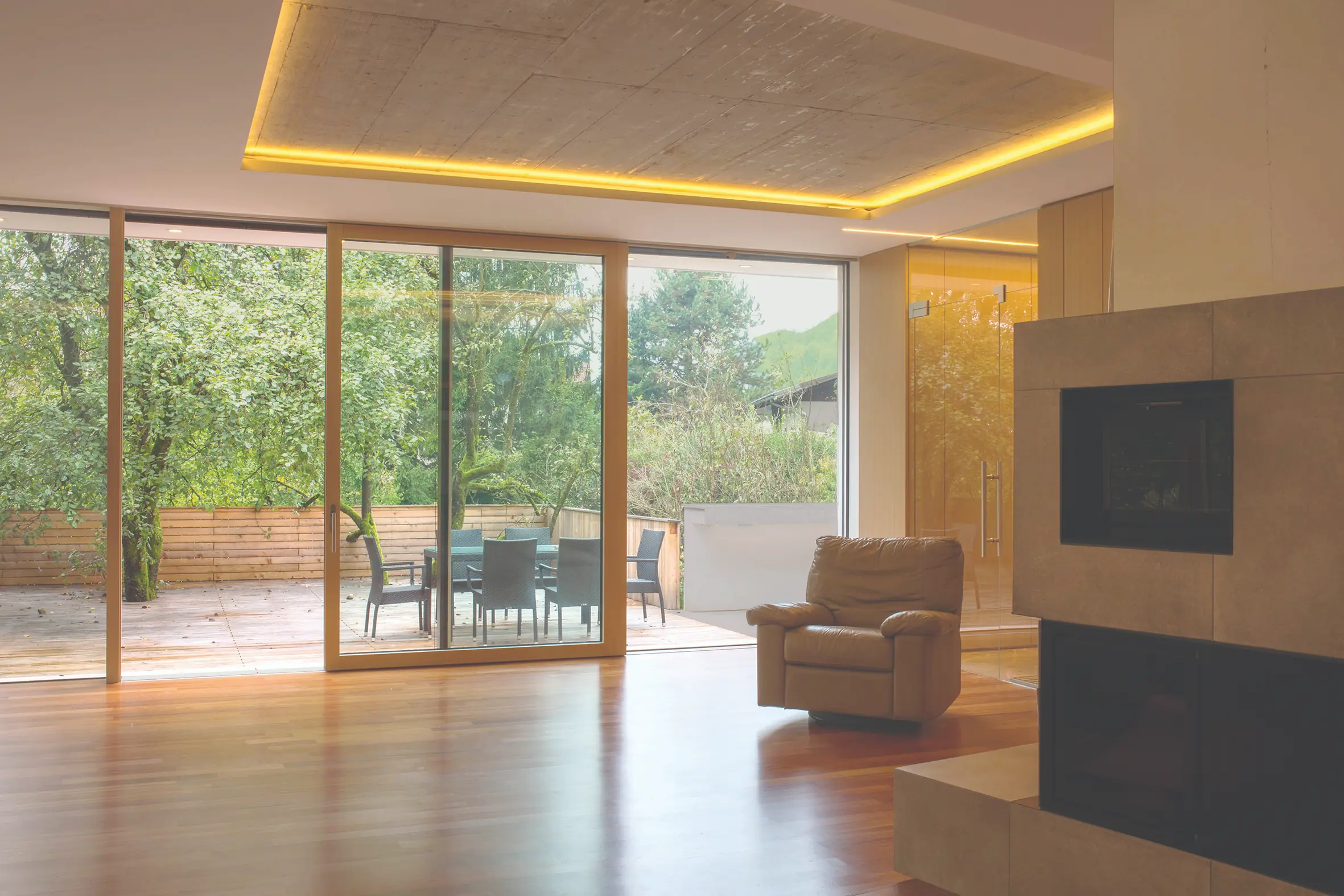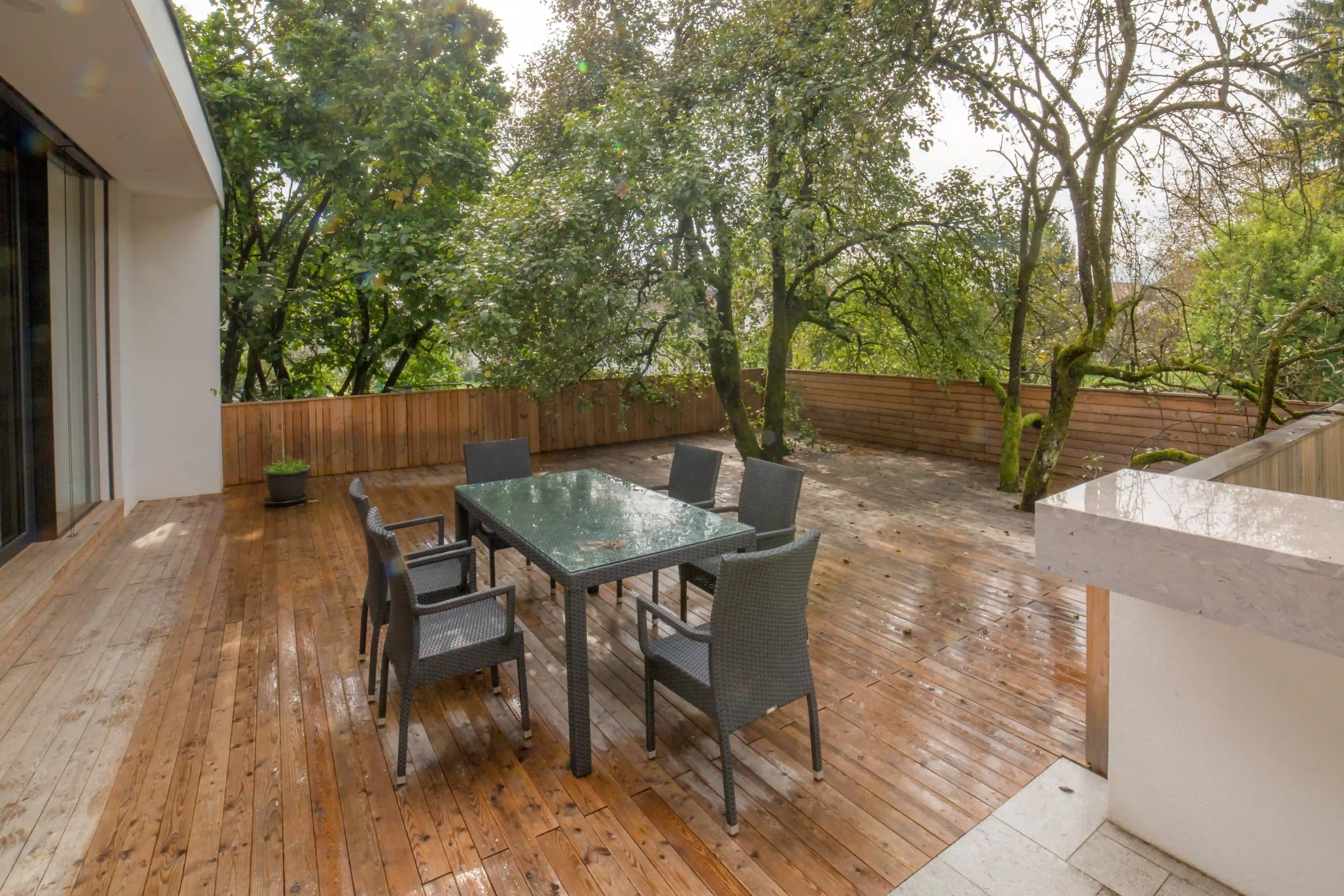 Družina je pridobila odprt, svetel in pretočen bivalni prostor, ki briše mejo med notranjostjo in zunanjostjo. Terasa je postala osrednje prizorišče družinskega življenja – prostor za počitek, druženje in tišino v zavetju krošenj.