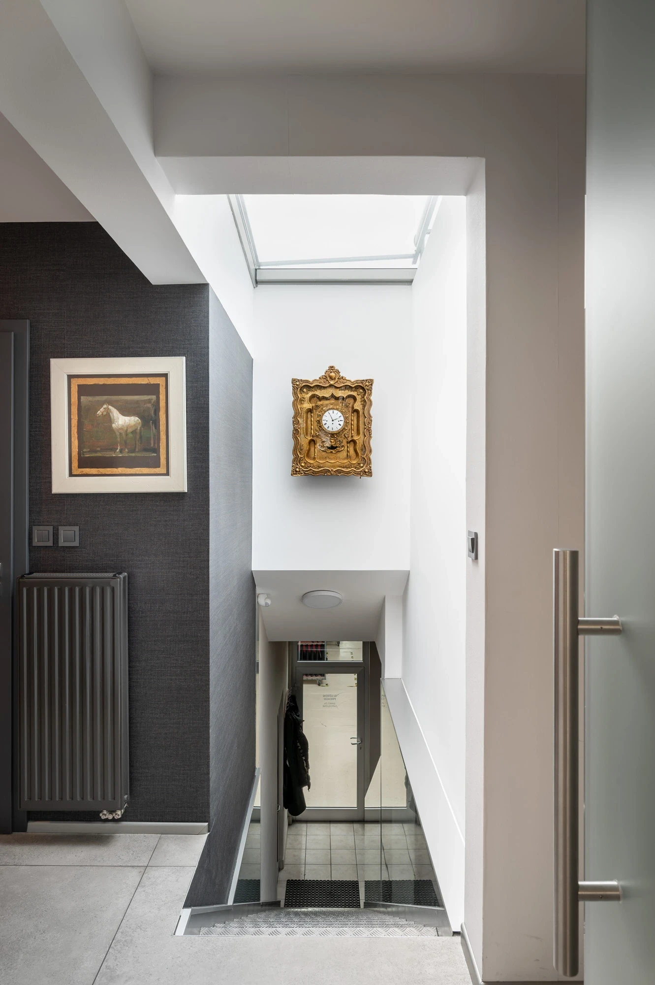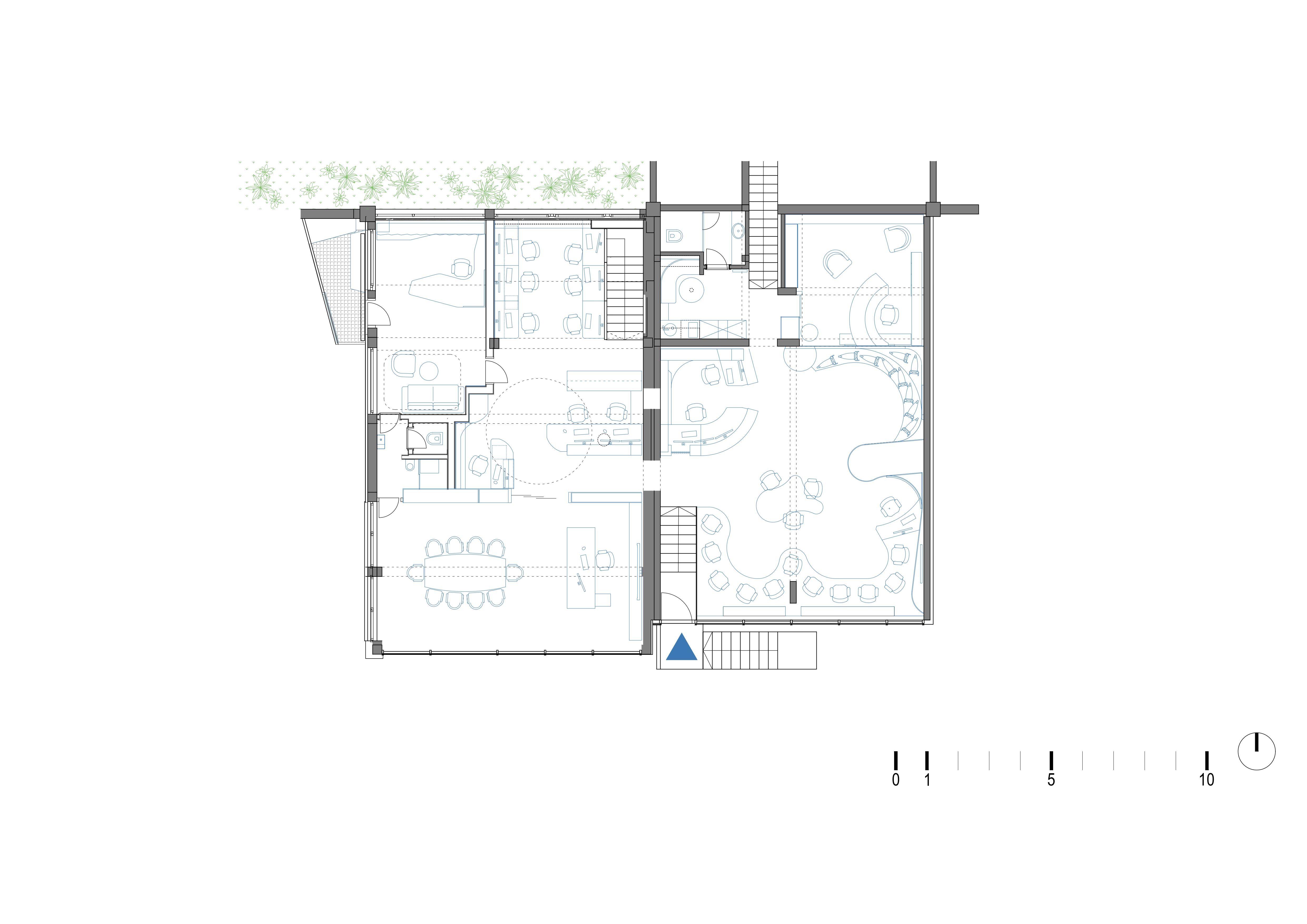 Nove pisarniške površine smo pridobili z izrabo obstoječega dvovišinskega skladiščnega atrija med proizvodno halo in upravno stavbo. Z reuse pristopom je prostor dobil novo funkcijo, naravna osvetlitev pa je zagotovljena s celostensko zasteklitvijo nad visokim parapetom. Pogled na streho hale mehča ekstenzivna zazelenitev, ki prostoru daje prijetnejši in bolj human značaj.